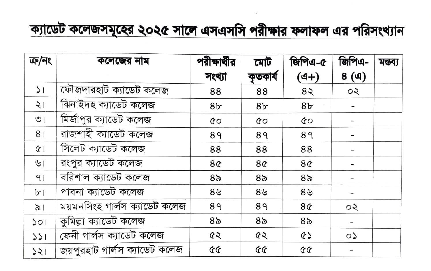 বাংলাদেশের ক্যাডেট কলেজসমূহের ঈর্ষণীয় ফলাফল অর্জন-এসএসসি ২০২৫