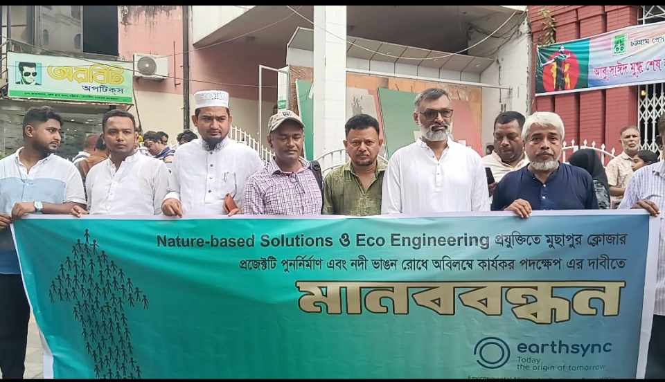 আর্থ সিঙ্ক-এর উদ্যোগে আজ ১৭ আগস্ট সকাল ১১টায় চট্টগ্রাম প্রেসক্লাব প্রাঙ্গণে এক মানববন্ধন অনুষ্ঠিত হয়। কর্মসূচিতে ‘মুছাপুর ক্লোজার প্রজেক্ট’ এর দ্রুত পুনঃনির্মাণ, ছোট ফেনী নদীর ভয়াবহ ভাঙন রোধ, ক্ষতিগ্রস্ত জনগণের নিরাপদ পুনর্বাসন এবং সোনাগাজীর টেকসই উন্নয়নের দাবি জোরালোভাবে উপস্থাপন করা হয়।