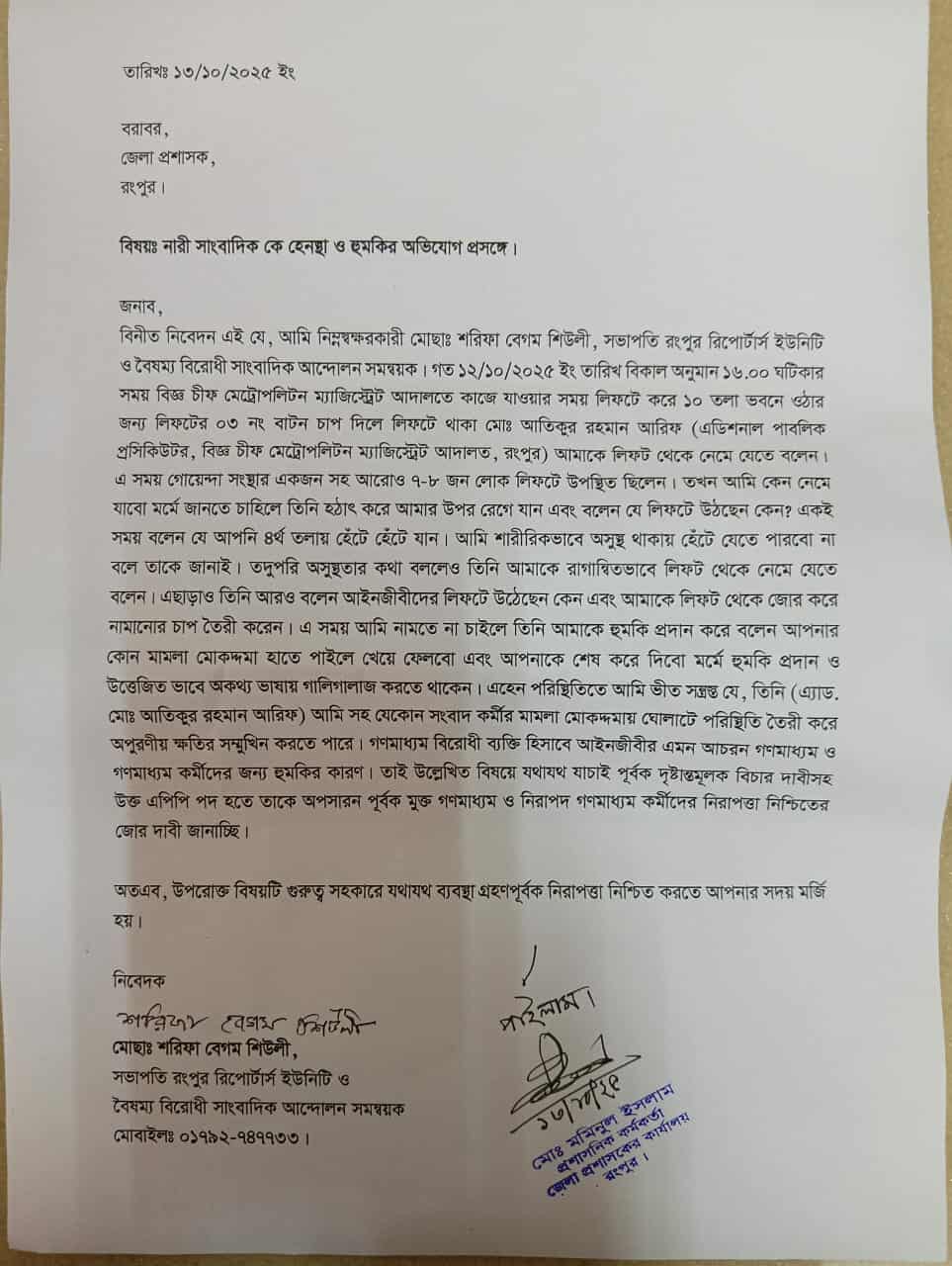 মোছাঃ শরিফা বেগম শিউলী, রংপুর রিপোর্টার্স ইউনিটির সভাপতি ও বৈষম্য বিরোধী সাংবাদিক আন্দোলনের ৩ প্রধান সমন্বয়ক এর একজন। গত ১২ অক্টোবর ২৫ ইং তারিখে বিকাল ৪টার দিকে চীফ মেট্রোপলিটন ম্যাজিস্ট্রেট আদালতে কাজে যাওয়ার সময় লিফটে ১০ তলা ভবনে ওঠার সময় লিফটের ০৩ নং বাটন চাপ দিলে লিফটে থাকা মোঃ আতিকুর রহমান আরিফ (এডিশনাল পাবলিক প্রসিকিউটর, চীফ মেট্রোপলিটন ম্যাজিস্ট্রেট আদালত, রংপুর) আমাকে লিফট থেকে নেমে যেতে বলেন। এ সময় গোয়েন্দা সংস্থার একজন সহ আরোও ৭/৮ জন সাধারণ জনগণ লিফটে উপস্থিত ছিলেন। তখন আমি কেন নেমে যাবো জানতে চাহিলে তিনি হঠাৎ করে আমার উপর রেগে যান এবং বলেন লিফটে উঠছেন কেন? ৪র্থ তলায় যেতে লিফটে ওঠা লাগে?? নামেন হেঁটে হেঁটে যান।