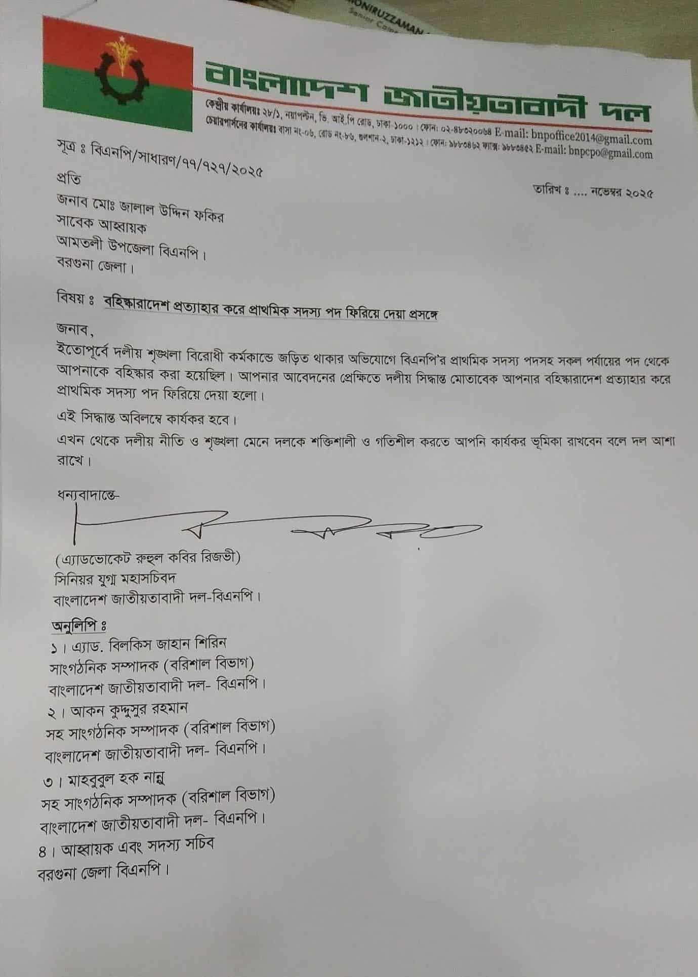 বিএনপির ভারপ্রাপ্ত দপ্তর সম্পাদক এ্যাড.রুহুল কবির রিজভী স্বাক্ষরিত এক চিঠিতে এ তথ্য জানানো হয়। চিঠিতে বলা হয়েছে, জালাল উদ্দিন ফকিরের আবেদনের প্রেক্ষিতে তার বহিষ্কারাদেশ প্রত্যাহার করে দলীয় সিদ্ধান্ত মোতাবেক তার প্রাথমিক সদস্যপদ ফিরিয়ে দেওয়া হলো।