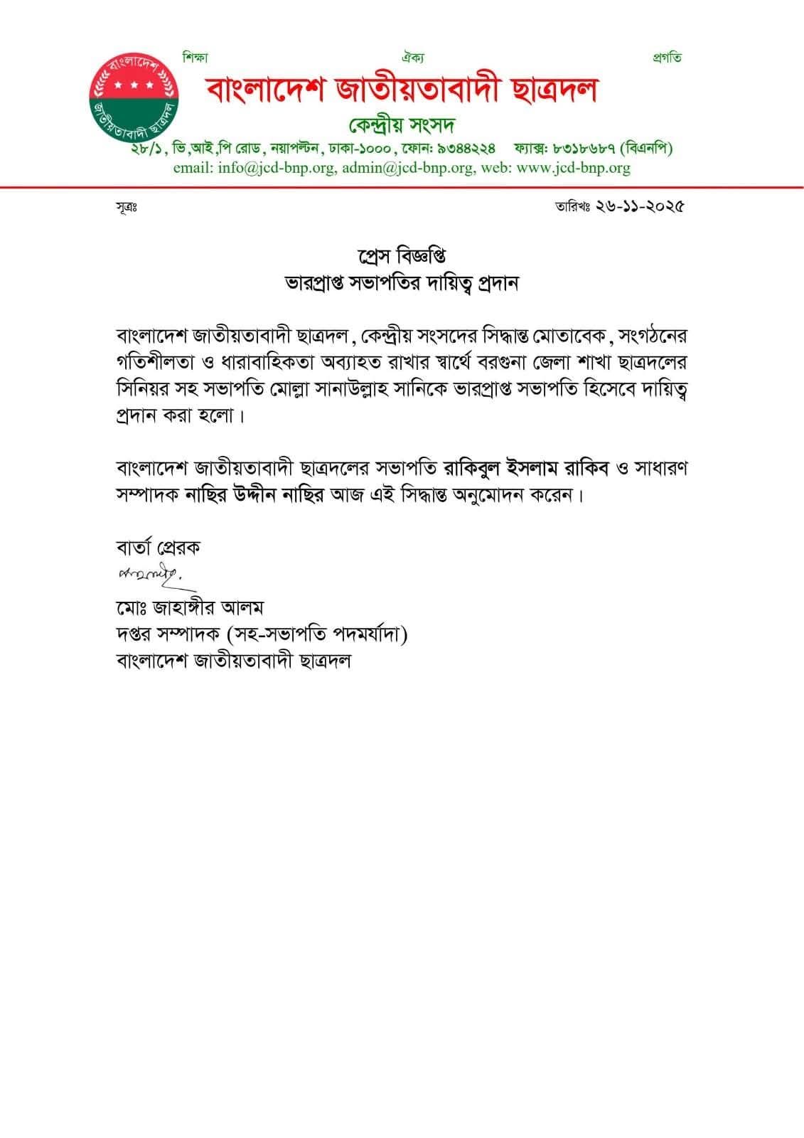 বাংলাদেশ জাতীয়তাবাদী ছাত্রদল কেন্দ্রীয় সংসদের সিদ্ধান্ত মোতাবেক বরগুনা জেলা ছাত্রদলের সিনিয়র সহ-সভাপতি মোল্লা সানাউল্লাহ সানিকে সংগঠনের ভারপ্রাপ্ত সভাপতি হিসেবে দায়িত্ব প্রদান করা হয়েছে।