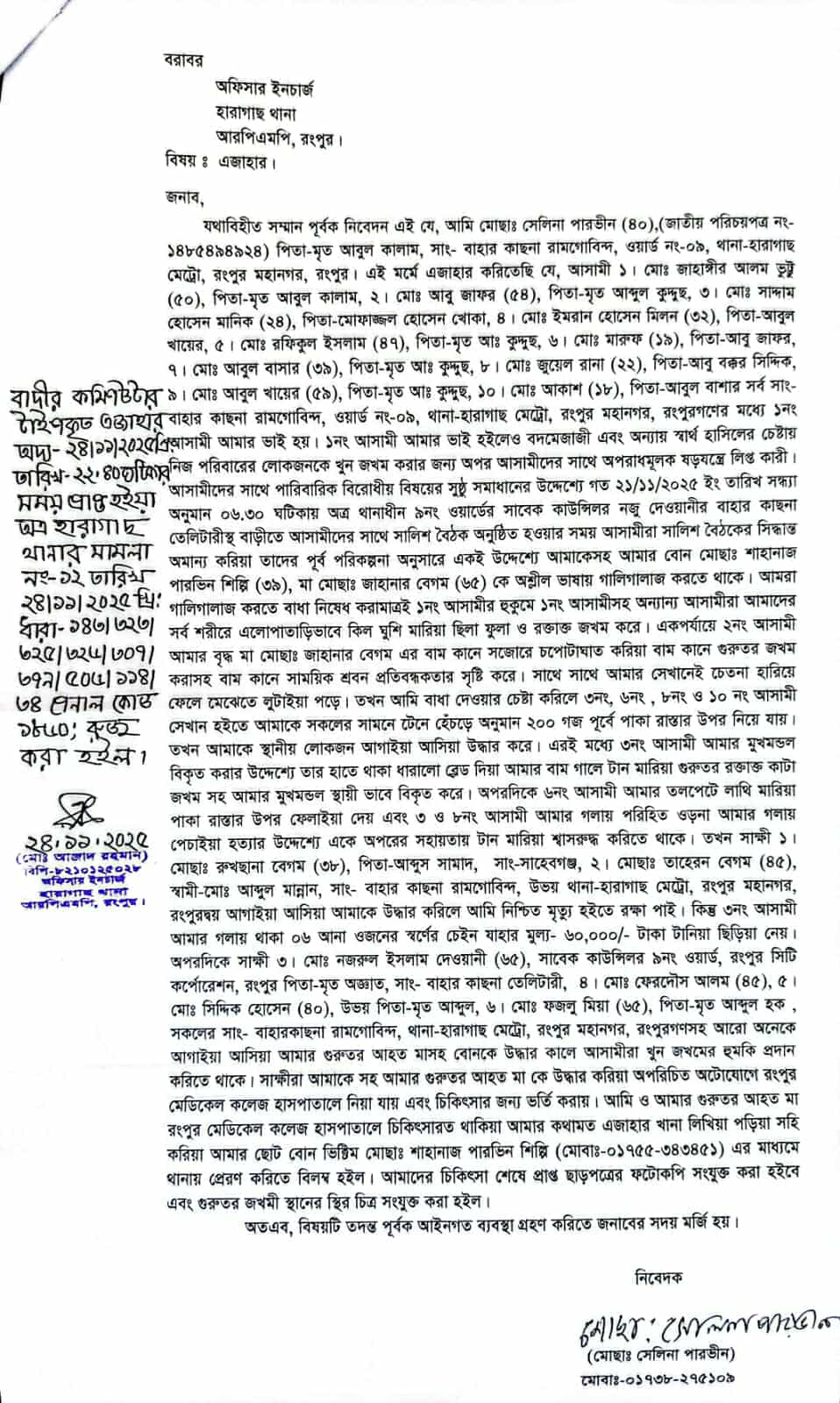 এ সময় উপস্থিত শালিসি বৈঠকের লোকজন ও স্থানীয়রা আহত অবস্থায় আমাকে ও আমার মা জাহানারা বেগমকে উদ্ধার করে রংপুর মেডিকেল কলেজ হাসপাতাল পাঠিয়ে দেয়। সেখানেই আমরা চিকিৎসাধীন থাকার পরে সুস্থ হয়ে বাসায় আসি।