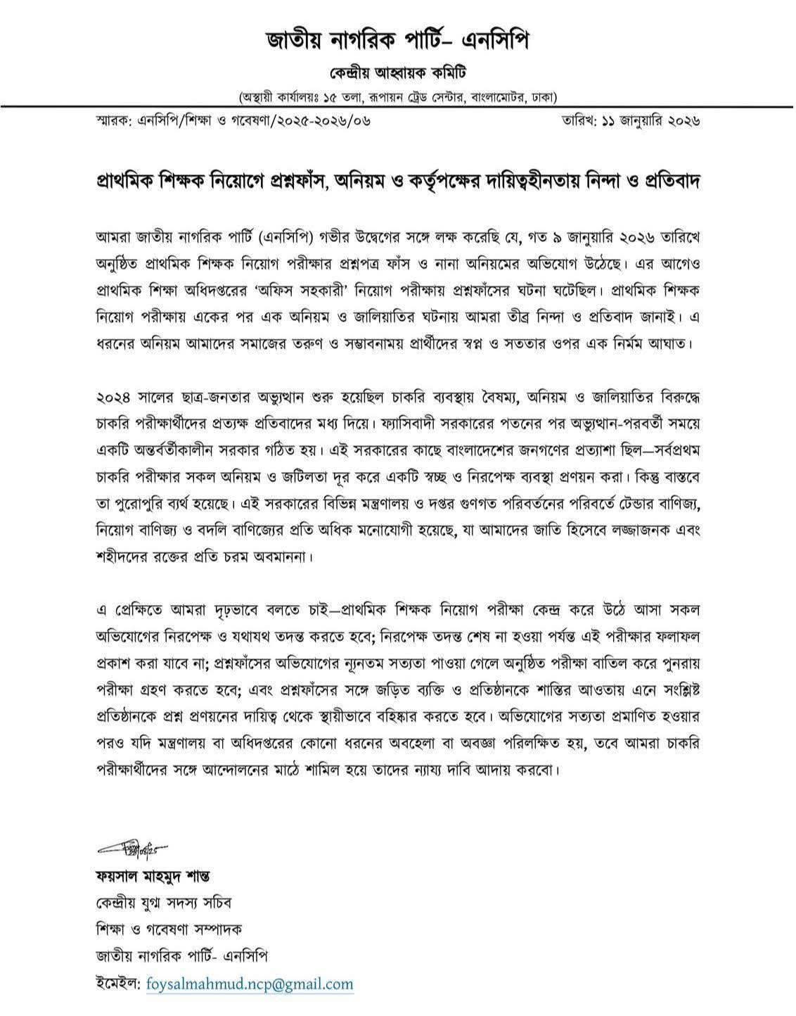 আমরা জাতীয় নাগরিক পার্টি (এনসিপি) গভীর উদ্বেগের সঙ্গে লক্ষ করেছি যে, গত ৯ জানুয়ারি ২০২৬ তারিখে অনুষ্ঠিত প্রাথমিক শিক্ষক নিয়োগ পরীক্ষার প্রশ্নপত্র ফাঁস ও নানা অনিয়মের অভিযোগ উঠেছে। এর আগেও প্রাথমিক শিক্ষা অধিদপ্তরের ‘অফিস সহকারী’ নিয়োগ পরীক্ষায় প্রশ্নফাঁসের ঘটনা ঘটেছিল। প্রাথমিক শিক্ষক নিয়োগ পরীক্ষায় একের পর এক অনিয়ম ও জালিয়াতির ঘটনায় আমরা তীব্র নিন্দা ও প্রতিবাদ জানাই। এ ধরনের অনিয়ম আমাদের সমাজের তরুণ ও সম্ভাবনাময় প্রার্থীদের স্বপ্ন ও সততার ওপর এক নির্মম আঘাত।