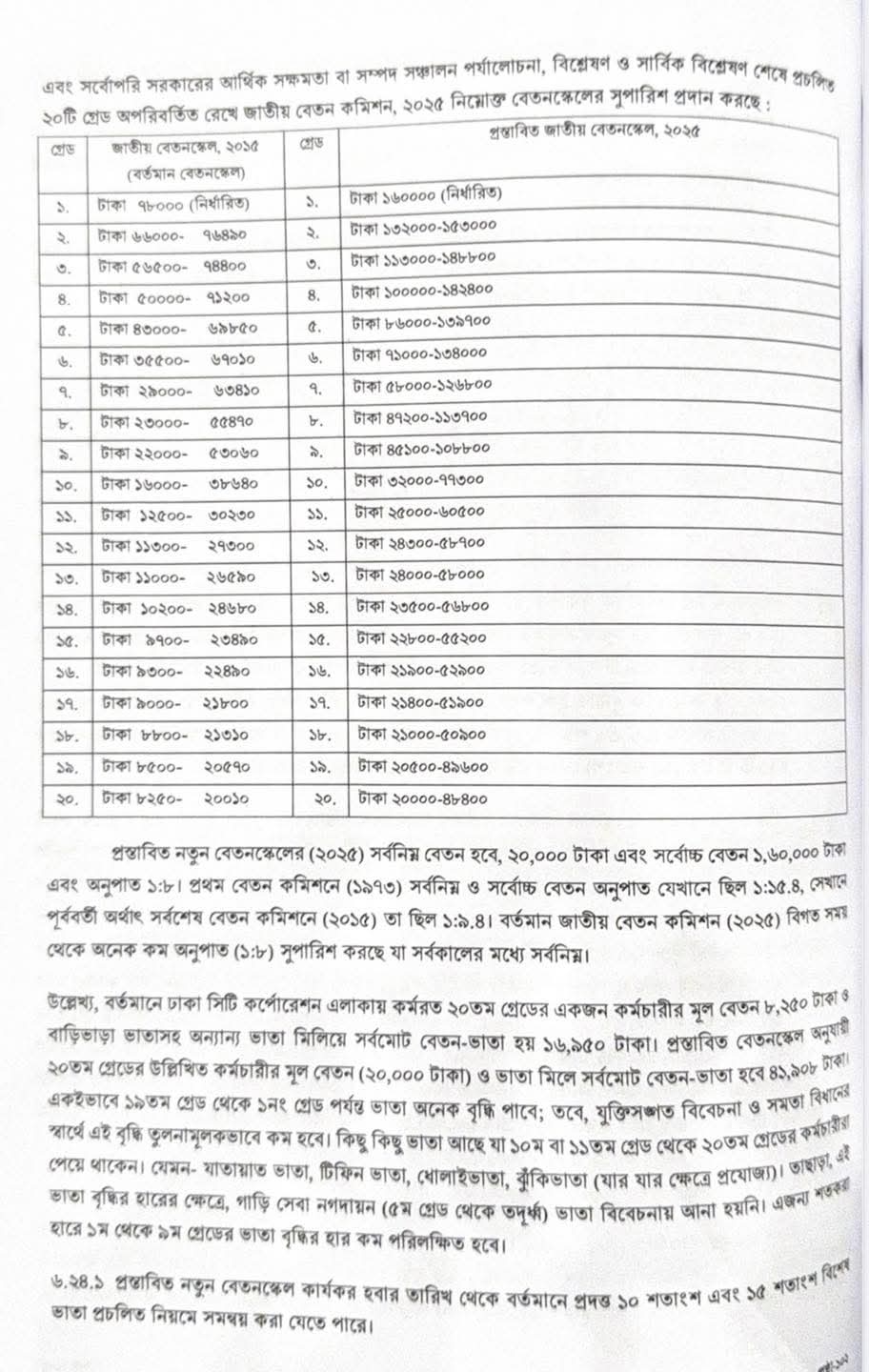 কমিশন সরকারি কর্মচারীদের জন্য ২০টি স্কেলে বেতন সুপারিশ করে। সর্বনিম্ন বেতন স্কেল ৮ হাজার ২৫০ টাকা থেকে বাড়িয়ে ২০ হাজার টাকা করার সুপারিশ করা হয়েছে এবং সর্বোচ্চ বেতন স্কেল ৭৮ হাজার টাকা থেকে বাড়িয়ে এক লাখ ৬০ হাজার টাকা করার সুপারিশ করা হয়েছে।