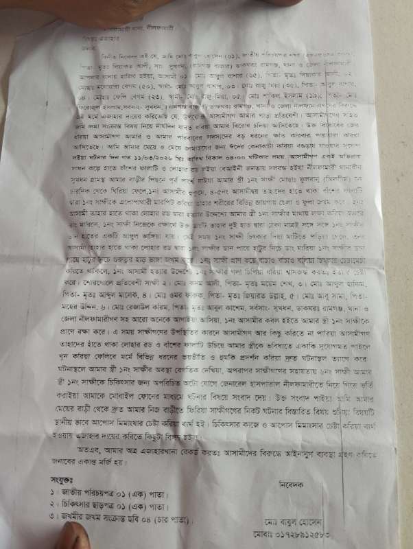 ফুলবানুর স্বামী/ বাবুল হোসেন অভিযোগ করে বলেন গত ১১/০৩/২৬ আমি বগুড়ায় থাকায় আমার স্ত্রীকে একা পেয়ে পরিকল্পিতভাবে হত্যার উদ্দেশ্যে রাজু গংরা এই ঘটনা ঘটিয়েছে এবং এখনো মোবাইল ফোনে বিভিন্ন রকম হুমকি ধামকি দিয়েই আসছে , এবিসয়ে আমি পাঁচজনকে আসামি করে নীলফামারী সদর থানায় অভিযোগ করেছি, আমি সাংবাদিকদের মাধ্যমে প্রশাসনের সুদৃষ্ট কামনা করছি।